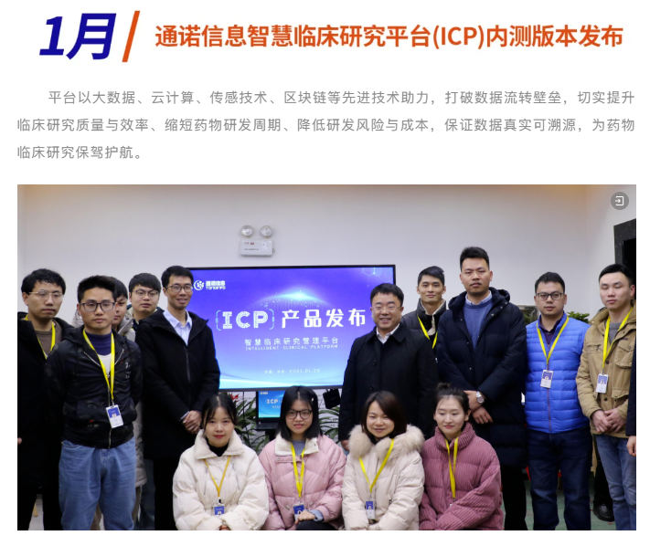 2021年(nián),通(tōng)諾信息圍繞藥學研發與臨床研究兩大(dà)領域,<↑銳意進取、創優創新,形成“兩大(dà)平台九大(dà)系統”β≠産品布局,覆蓋藥學研發與臨床研究全流程,實現(xiàn)新跨越,再創新巅峰。